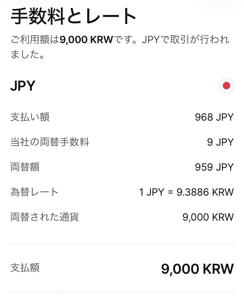 一番左が韓国での支払いと手数料、為替レートなどです。また真ん中の画像は、マドリードでのスーパーで買い物したときの支払い、その横が電車に乗るときの切符を買った時の支払いなどの明細です。韓国での両替手数料が約1%になっていますが、これはおそらく空港での両替となったためかと考えられます。残りのマドリードでの両替手数料はどちらも約0.6%となっています。
