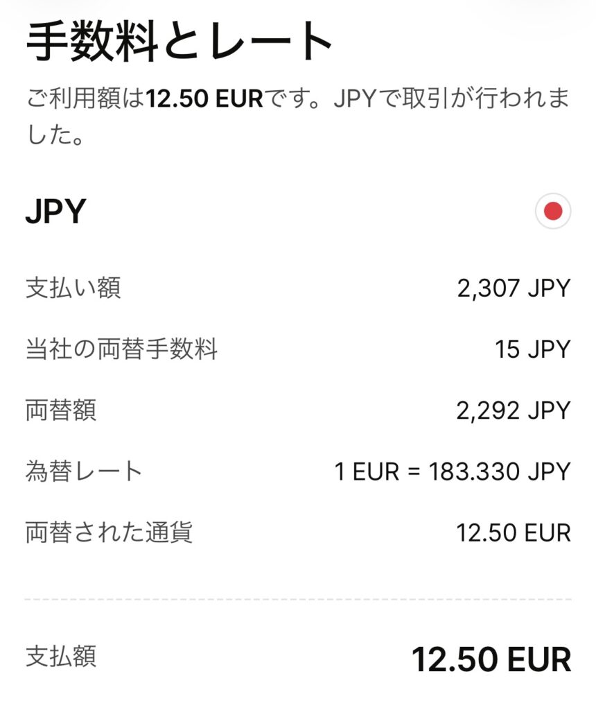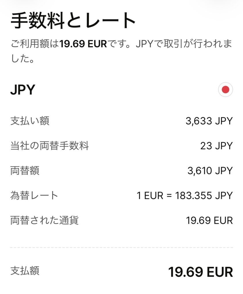 さて、私はどことも覚えていないところでATMを使いました(多分宿泊はしていないホテルの入り口の横あたりにあった)。そのときは友人と一緒だったので、友人が周りに怪しい人がいないかを見張っていてくれました。まず、Wiseアプリ内で日本円をEURに両替しました。それからそのEURをATMで引き出しました。取引明細がこちらです。